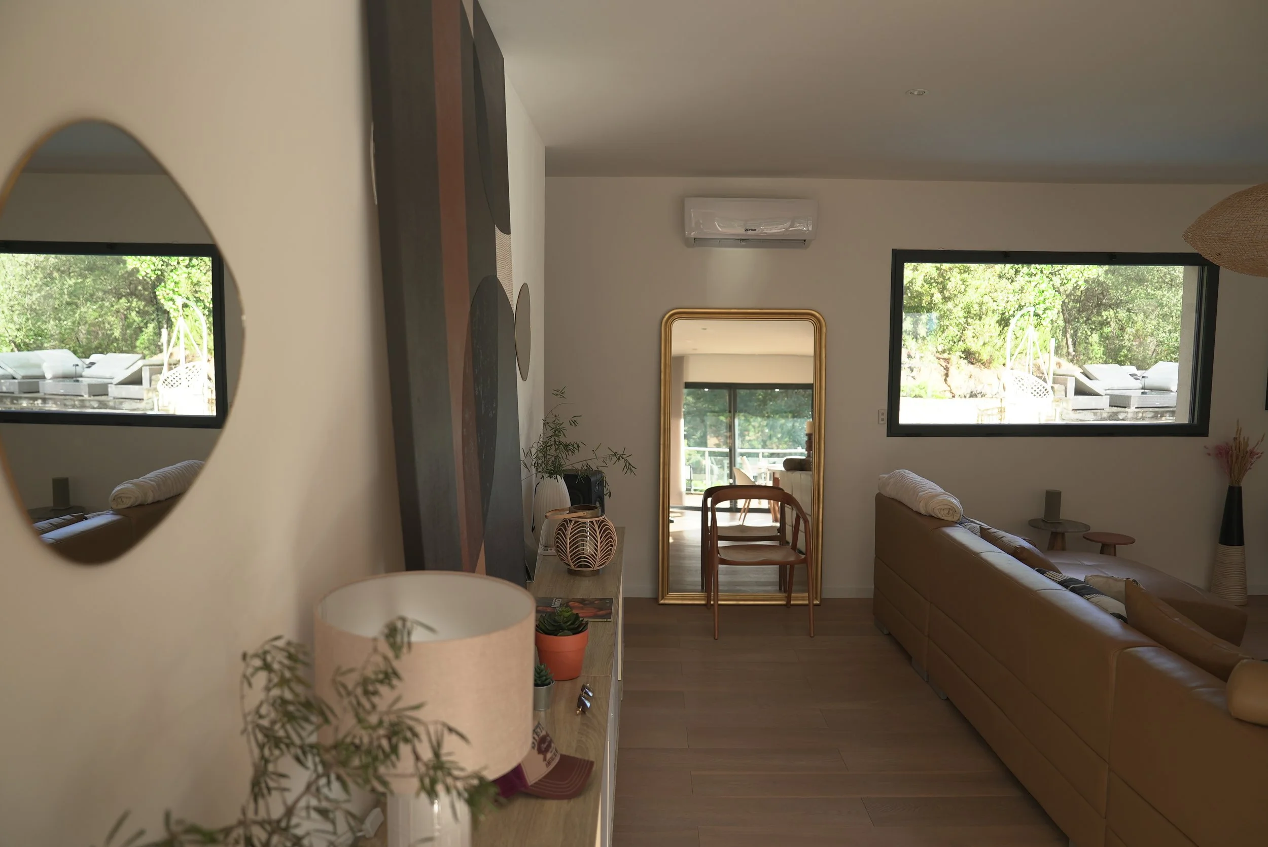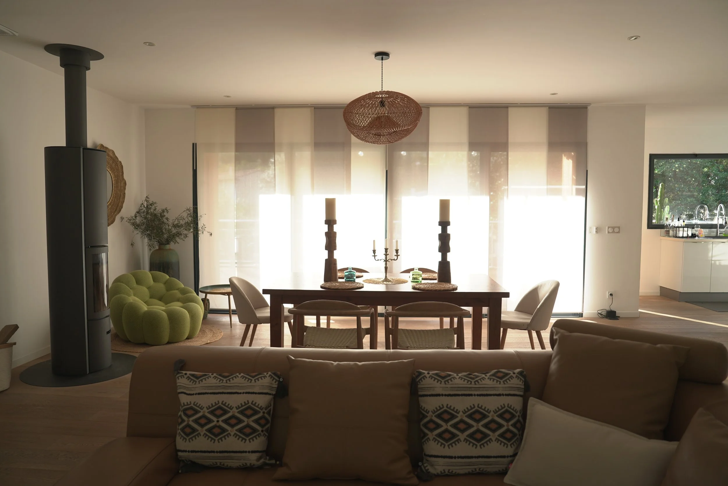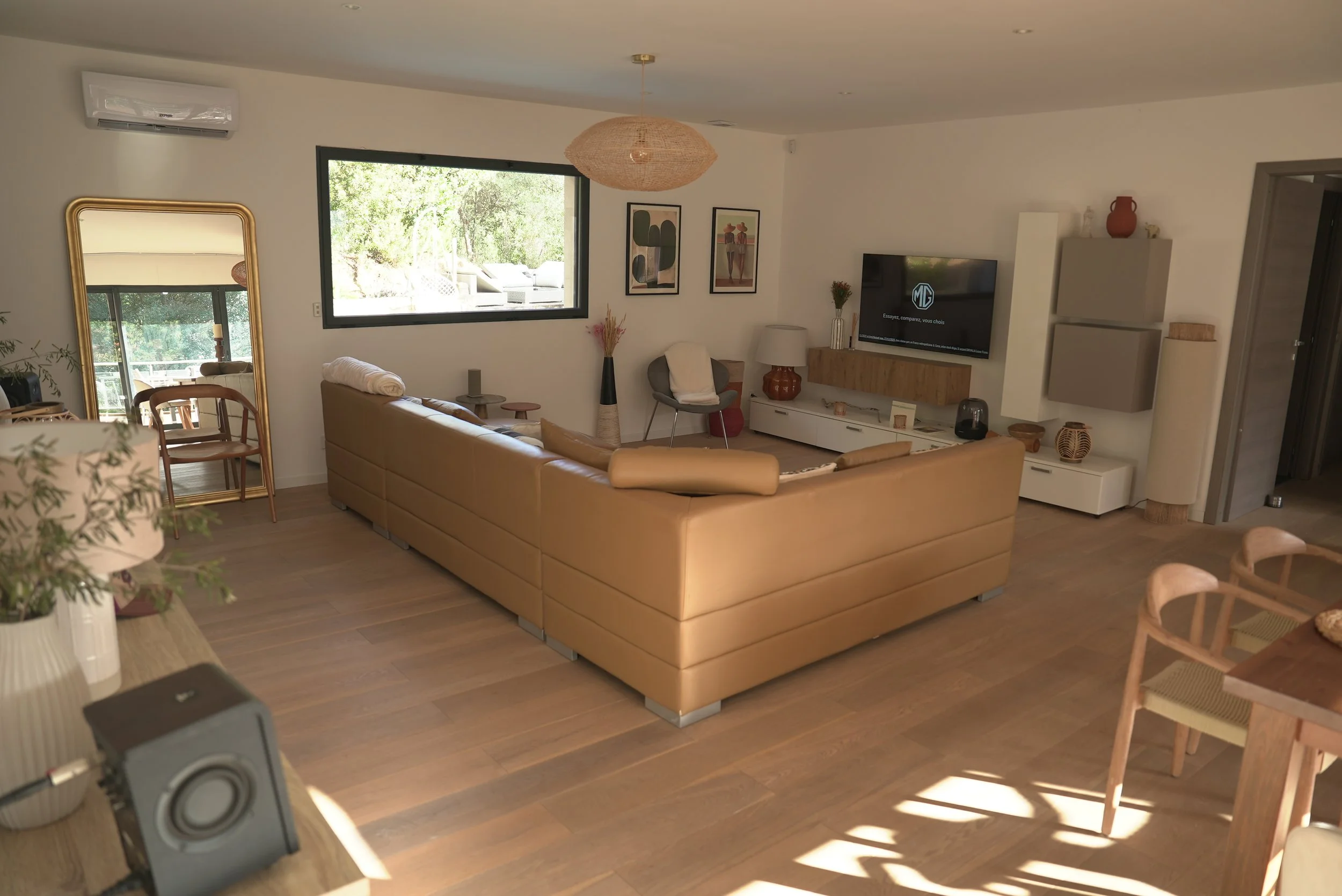 Grand séjour de 70m2 composé d’une partie Salon et d’une partie Salle à Manger avec une table en noyé pour 8 Personnes, d’un grand canapé, de fauteuils , d’un Poil à Bois, d’une Grande smart TV connecté et d’un Système son Focal.