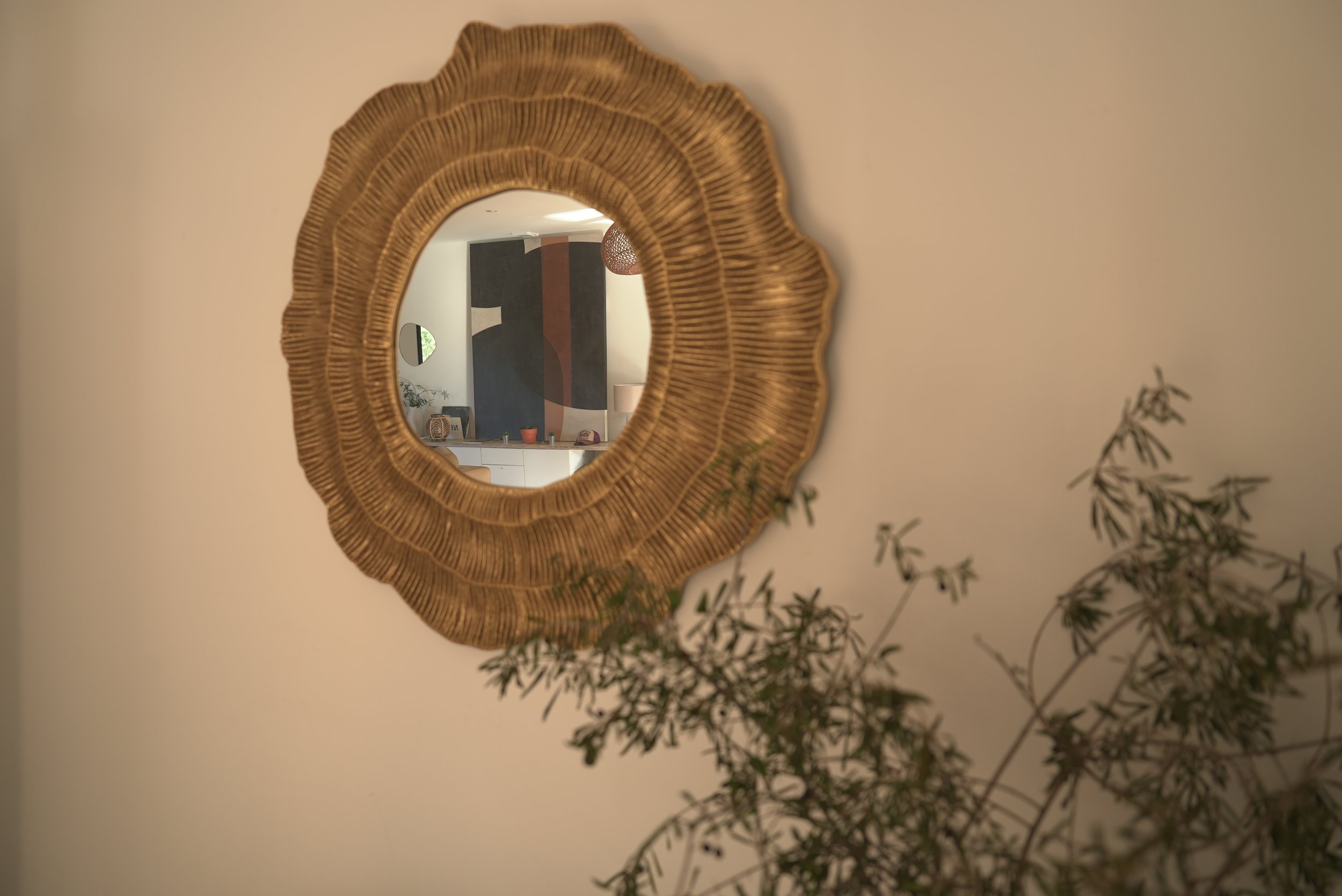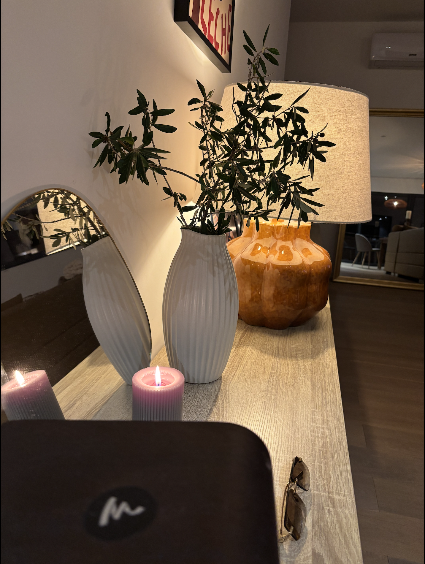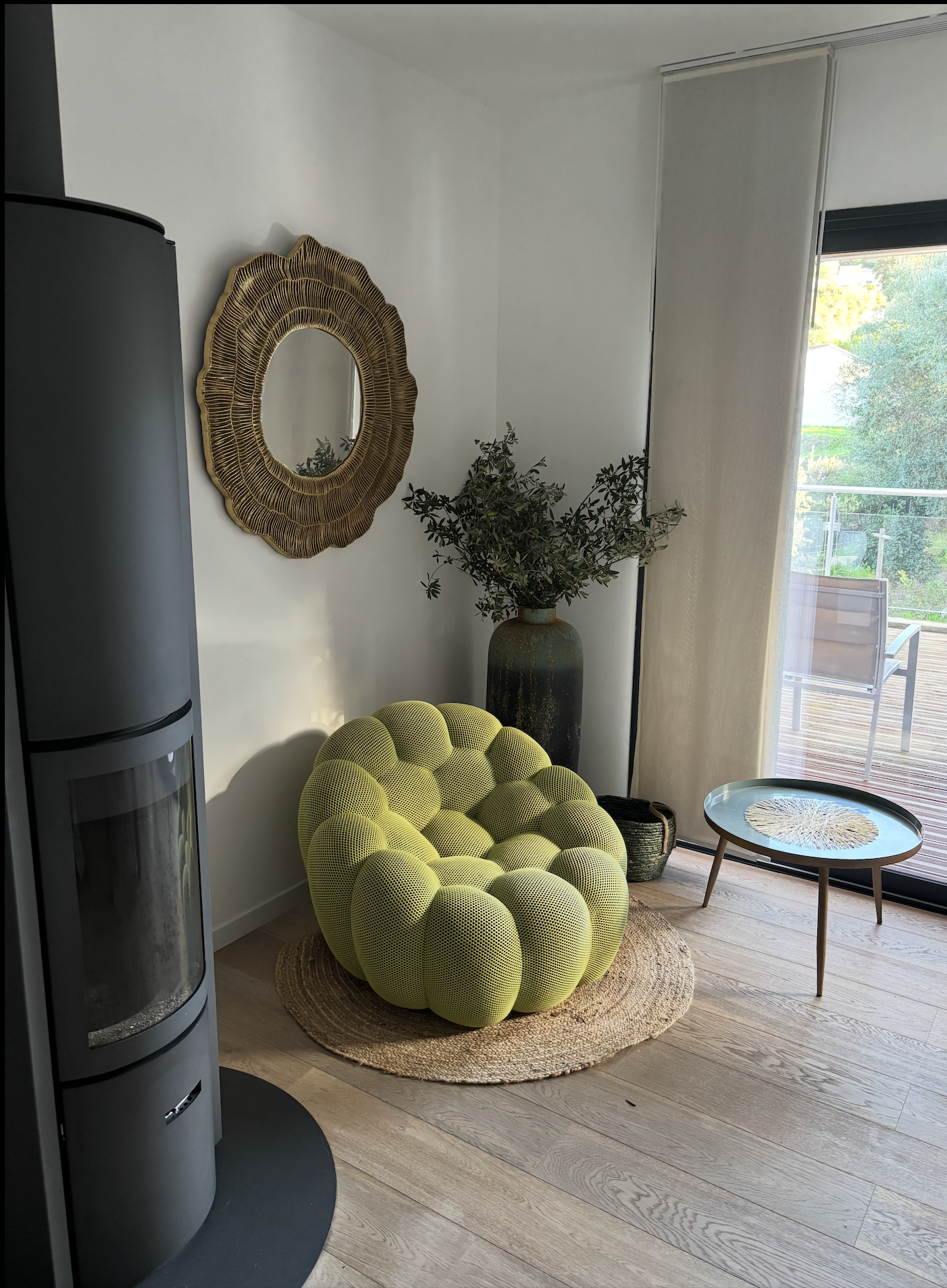 Grand séjour de 70m2 composé d’une partie Salon et d’une partie Salle à Manger avec une table en noyé pour 8 Personnes, d’un grand canapé, de fauteuils , d’un Poil à Bois, d’une Grande smart TV connecté et d’un Système son Focal.